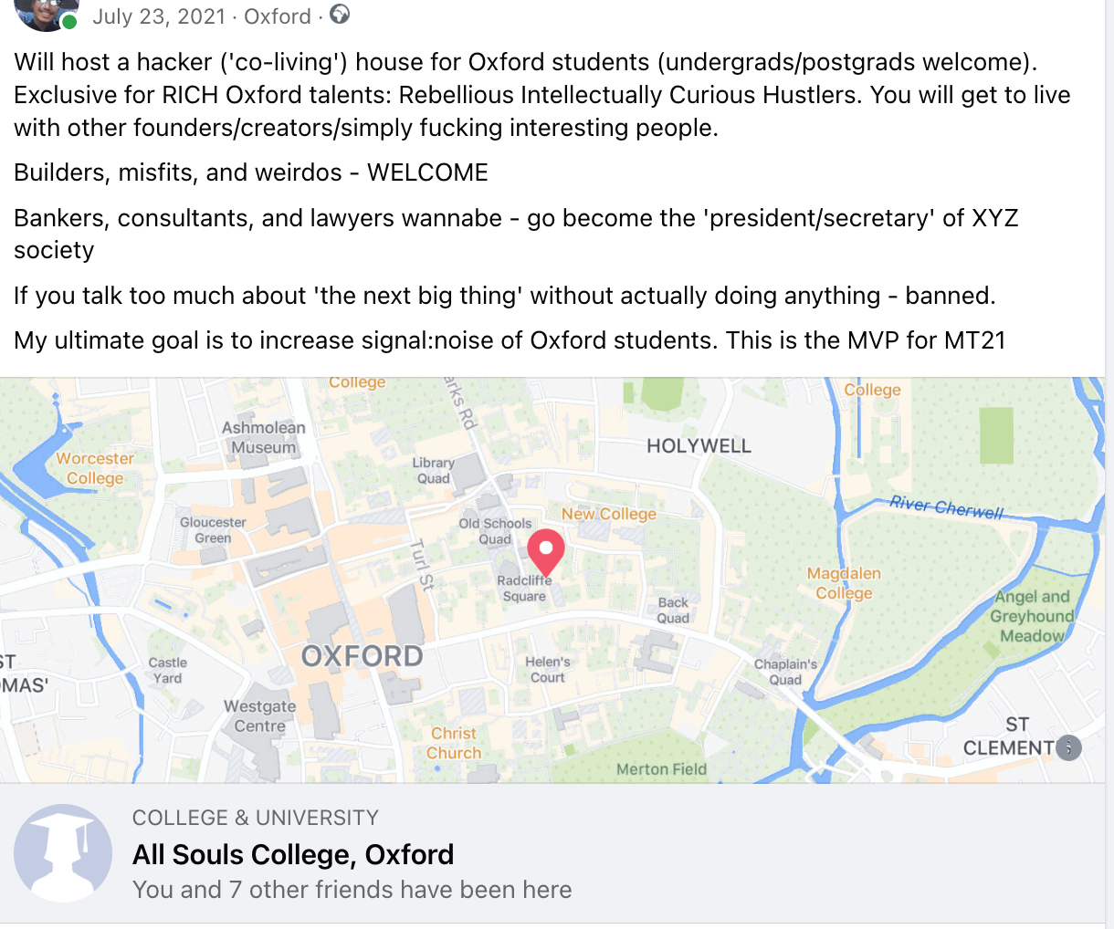 In other words, I only intended to start a house to live with misfits, weirdos, and builders. I was fed up with living with normies and mids who drink wine, eat cheese and get by each day at Oxford by doing minimum work.