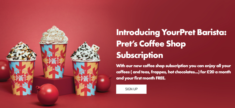This is a kind of coffee contract. A membership inside the “Pret” club. Similar to how you pay for Netflix for binge-watching The Crown every month, you pay Pret each month for its coffee.